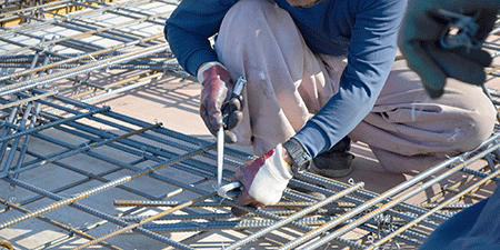 「ハッカー」と呼ばれる工具と結束線を使って、鉄筋の交差部を縛る作業です。しっかりと結束することによって、骨組みの強度が増します。