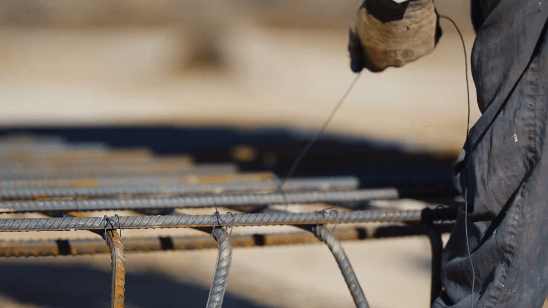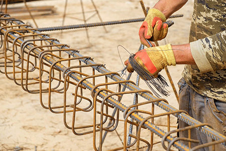 「ハッカー」と呼ばれる工具と結束線を使って、鉄筋の交差部を縛る作業です。しっかりと結束することによって、骨組みの強度が増します。